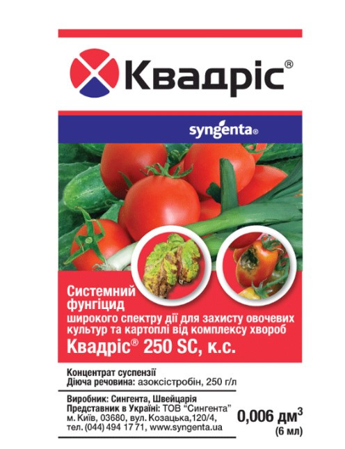 Механізм дії: Квадріс належить до нового класу препаратів- стробілуринів. Має системну, профілактичну, лікувальну, викорінювальну дію і трансламінарну властивість. Лікувальна дія- 2 доби, що дозволяє знищити збудника хвороби під час інкубаційного періоду. Викорінювальна дія дозволяє зупинити поширення інфекції й розвиток хвороби на ділянці. Єдиний препарат, який захищає овочеві культури від усіх основних хвороб: борошнистої роси, фітофторозу, макроспоріозу, несправжньої борошнистої роси, плямистостей та інше. Дозволяє не тільки захистити і вилікувати рослини, а й подовжує на 2-3 тижні плодоношення культур. Застосування в період збирання овочів суттєво покращує їх зберігання у сховищах і домашніх умовах. Препарат, безпечний для користувача й довкілля.